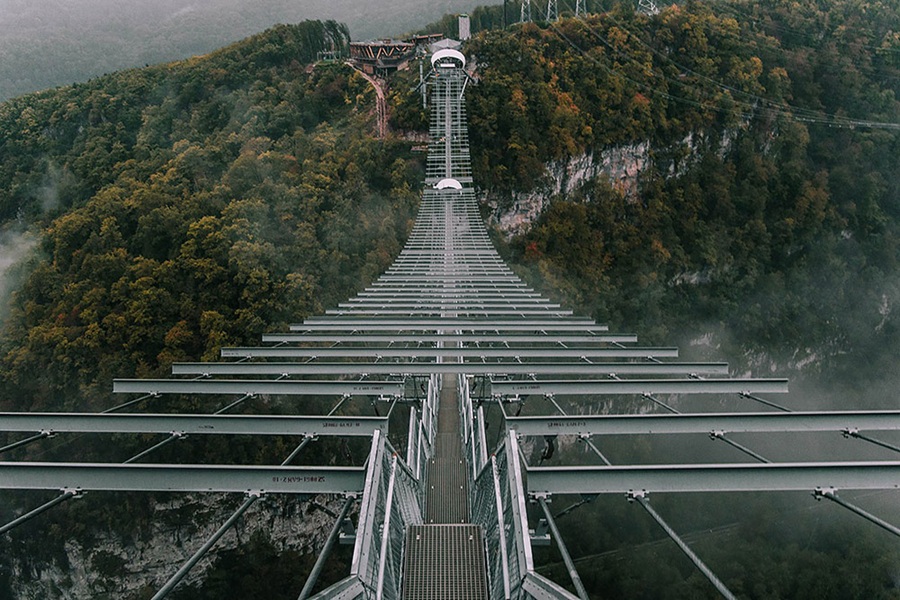 SkyBridge, en el Parque Nacional Sochi, Rusia, es un puente colgante de 439 metros de longitud a 207 metros sobre el río Mzymta, con bungee opcional desde el centro. Su oscilación y vistas al Cáucaso lo hacen extremo.