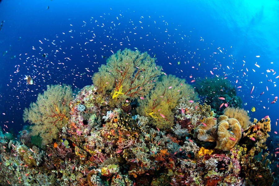 Tubbataha Reefs, en el Mar de Sulu, Filipinas, es un atolón doble con 360 especies de corales y 600 de peces, donde paredes verticales estallan en rojos y amarillos, hogar de tiburones ballena y mantas. Su claridad (hasta 40 m) revela un mundo vibrante.