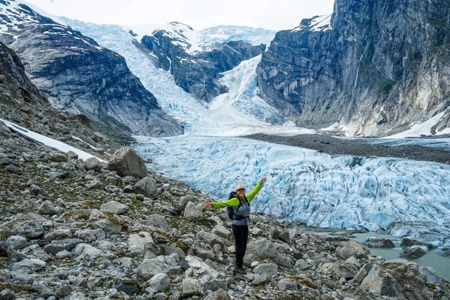 Jostedalsbreen, el glaciar más grande de Europa continental (487 km²), en Sogn og Fjordane, Noruega, narra la formación de fiordos hace 10,000 años con sus brazos que descienden a valles, revelando capas de nieve de la Pequeña Edad de Hielo.
